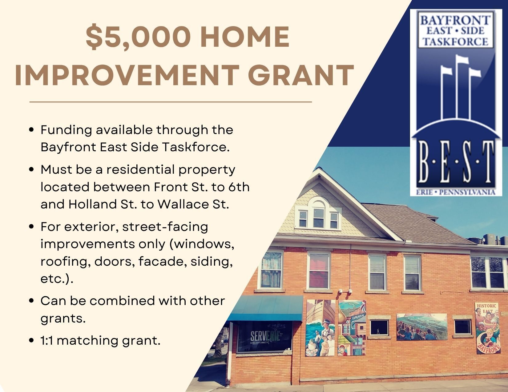 The Bayfront East Side Taskforce provides neighborhood homeowners the opportunity to access grant funding to improve and rehab their property’s exteriors. This funding is awarded in an effort to beautify our neighborhood through restoring home facades, addressing code violations, and emergency repairs. Funding for these types of improvements are grant related, so please check our website and contact us to see what other resources are currently available.