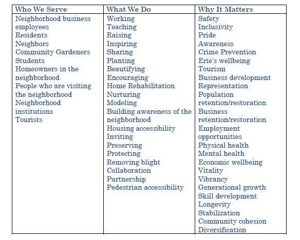 Our central themes are: organizing the community, building a positive neighborhood image, increasing neighborhood pride, and beautifying the neighborhood. We also strive to promote home ownership, improve communication, and serve in a concerted and collaborative role with local government. We work with many partners in our community to improve safety and build stability, fostering a sense of community.